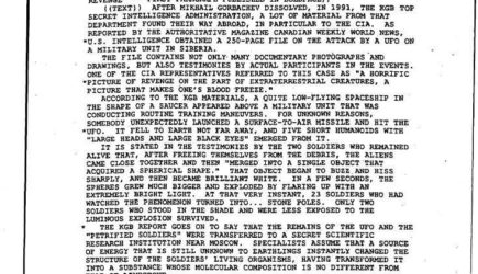 В документе говорится, что советские солдаты якобы сбили НЛО, пролетавший над военной базой. Сообщается, что инопланетяне-гуманоиды выбрались из обломков, слились в один объект и вспыхнули ярким светом, превратив всех 23 советских солдат, кроме двоих, в камень.
